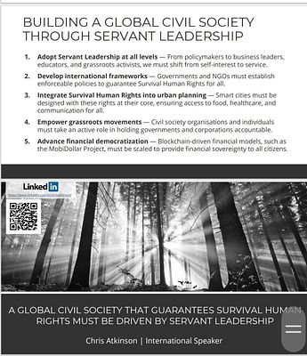 We stand at a turning point in history. The decisions we make today will shape the future of humanity. If we fail to guarantee Survival Human Rights, we risk a world where inequality deepens, suffering increases, and conflicts escalate. However, if we embrace Servant Leadership, we can build a society where every person is given the fundamental right to survive and thrive.